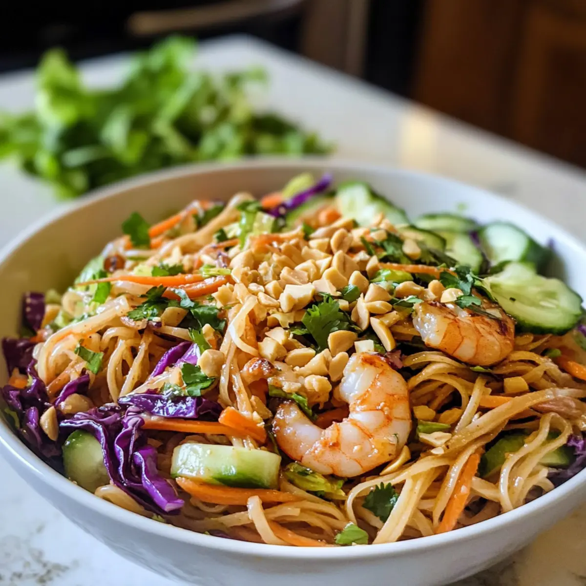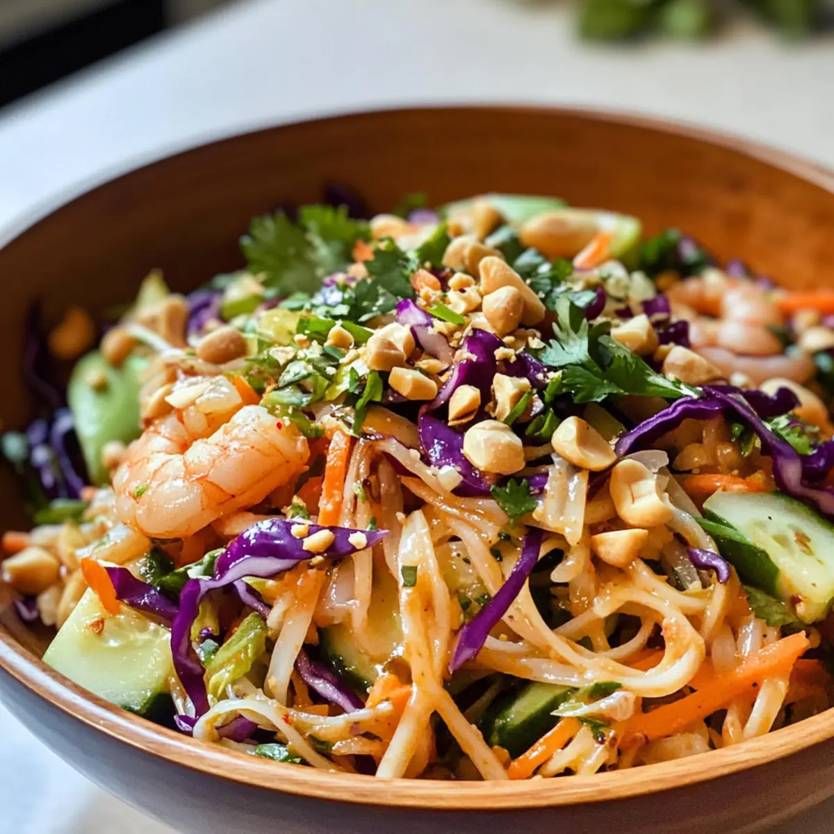 Es war ein sonniger Nachmittag, als ich plötzlich Lust auf etwas Frisches und Knackiges bekam. Ich dachte an die herrlichen Aromen von vietnamesischen Frühlingsrollen, aber in einer unkomplizierten und abenteuerlustigen Form. So entstand mein Thai Frühlingsrollen-Nudelsalat mit Erdnusssauce! Diese kreative Kombination aus köstlichen Reisnudeln, buntem Gemüse und einer cremigen, leicht würzigen Sauce ist nicht nur ein absolutes Dinner-Highlight, sondern auch perfekt für Meal Prep. Du kannst ihn im Voraus zubereiten und hast immer eine leckere Option parat, ganz ohne den Druck von Fast Food. Und das Beste: Er ist sowohl glutenfrei als auch vegane-freundlich, sodass alle Genießer auf ihre Kosten kommen. Bist du bereit, deinen Gaumen mit diesem knusprigen, geschmackvollen Salat zu verzaubern? Lass uns gemeinsam ins Rezept eintauchen! Warum wirst du diesen Salat lieben? Einfachheit: Die Zubereitung dieses Thai Frühlingsrollen-Nudelsalats ist unkompliziert und perfekt für Kochanfänger. Vielfältige Variationen: Ob vegan oder glutenfrei, dieser Salat lässt sich problemlos an verschiedene Ernährungsbedürfnisse anpassen. Frische und Crunch: Mit knackigem Gemüse und glutenfreien Reisnudeln erhält jeder Biss eine erfrischende Textur, die den Gaumen erfreut. Meal Prep-Freundlich: Du kannst ihn im Voraus zubereiten und die Portionen leicht für die Woche einteilen, sodass du immer eine köstliche, gesunde Option zur Hand hast. Aromen aus der Ferne: Erlebe den exotischen Geschmack von vietnamesischen Frühlingsrollen, ohne die Mühe des Rollens! Wenn du auf der Suche nach mehr inspirierenden Rezepten bist, schau dir auch meine Meal Prep Ideen an. Thai Frühlingsrollen-Nudelsalat Zutaten Für den Salat Gekochte Reisnudeln – Die Grundlage des Salats sorgt für eine angenehme Kautextur; du kannst glutenfreie Nudeln oder Zoodles als Low-Carb-Option verwenden. Rotkohl – Bringt Crunch und lebendige Farbe; kann durch grünen Kohl oder knackigen Salat ersetzt werden. Römersalat – Sorgt für Frische und Knackigkeit; Endivie oder gemischte Blätter sind ebenfalls gut geeignet. Gurke – Fügt erfrischende Saftigkeit hinzu; kann durch Paprika oder Jicama ersetzt werden. Karotten – Trägt Süße und Farbe bei; geriebene oder fein gehackte Karotten sind ideal; alternativ gehen auch Radieschen. Koriander und Minze – Hauptakteure für Frische und Geschmacksverstärkung; diese können weggelassen oder durch Petersilie ersetzt werden. Frühlingszwiebeln – Bieten einen scharfen Geschmack; kann durch Schalotten oder normale Zwiebeln mit milderem Aroma ersetzt werden. Sojasprossen – Optionale Garnierung für zusätzlichen Crunch; können weggelassen oder durch geriebene Daikon-Rettich ersetzt werden. Gekochte Garnelen – Liefert Protein; ersetzbar durch gekochtes Hähnchen, Tofu oder Kichererbsen für vegetarische Varianten. Gehackte Erdnüsse – Fügen nussigen Geschmack und Knusprigkeit hinzu; ersetzbar durch Sesam- oder Sonnenblumenkerne bei Nussallergien. Für das Dressing Niedriger Natrium Sojasauce – Bietet Umami; Tamari oder Kokosnuss-Aminosäuren können für glutenfreie Diäten verwendet werden. Reisessig – Fügt Säure hinzu; kann durch normalen Essig ersetzt werden. Sesamöl – Verstärkt den Geschmack; Oliven- oder Avocadoöl sind auch eine Option. Knoblauch und Ingwer – Aromastoffe, die für Geschmacksintensität sorgen; frisch ist am besten, Alternativen sind Knoblauchpulver oder gemahlener Ingwer. Cremige Erdnussbutter – Der Hauptdarsteller im Dressing und ideal ist natürliche Erdnussbutter; Mandelbutter könnte eine Alternative sein. Honig – Für eine süße Note; ahornsirup kann für eine vegane Version verwendet werden. Sriracha – Fügt optionale Schärfe hinzu; kann durch Chilisauce ersetzt oder weggelassen werden. Limettensaft – Bringt frische Säure; Zitronensaft kann genutzt werden, wenn keine Limetten verfügbar sind. Mit diesen Zutaten bist du bestens gerüstet, um einen köstlichen Thai Frühlingsrollen-Nudelsalat zuzubereiten, der sowohl frisch als auch sättigend ist! Schritt-für-Schritt-Anleitungen für Thai Frühlingsrollen-Nudelsalat mit Erdnusssauce Step 1: Reisnudeln vorbereiten Koche die Reisnudeln gemäß den Anweisungen auf der Verpackung, normalerweise etwa 6–8 Minuten in kochendem Wasser, bis sie weich sind. Gieße sie anschließend in ein Sieb ab und spüle sie kurz mit kaltem Wasser, um das Garverfahren zu stoppen. Lass die Nudeln gut abtropfen und stelle sie beiseite, während du die anderen Zutaten vorbereitest. Step 2: Gemüse und Garnelen mischen In einer großen Schüssel kombinierst du die vorbereiteten Reisnudeln, den feingehackten Rotkohl, gewürfelte Gurken, geriebene Karotten, frischen Koriander, Minze und geschnittene Frühlingszwiebeln. Füge die optionalen Sojasprossen und gekochten Garnelen hinzu. Mische die Zutaten gründlich, bis alles gut vermengt und gleichmäßig verteilt ist, sodass dein Thai Frühlingsrollen-Nudelsalat bunt und ansprechend aussieht. Step 3: Dressing zubereiten Für das Dressing gib alle Zutaten: Sojasauce, Reisessig, Sesamöl, gehackten Knoblauch, geriebenen Ingwer, Erdnussbutter, Honig, Sriracha und Limettensaft in eine Schüssel. Verquirle die Mischung mit einem Schneebesen für etwa 2–3 Minuten, bis eine glatte, cremige Sauce entsteht. Achte darauf, dass keine Klumpen sichtbar sind, damit das Dressing den Salat perfekt umhüllt. Step 4: Salat und Dressing vereinen Gieße das frisch zubereitete Dressing über den Thai Frühlingsrollen-Nudelsalat. Verwende eine große Zange oder einen Löffel, um alles vorsichtig zu vermengen, sodass jedes Gemüse und die Nudeln gleichmäßig mit der Erdnusssauce überzogen sind. Achte darauf, dass die Konsistenz schön cremig ist und der gesamte Salat gleichmäßig gewürzt wirkt. Step 5: Garnierung hinzufügen Vor dem Servieren streue die gehackten Erdnüsse großzügig über den Salat für zusätzlichen Crunch und nussigen Geschmack. Stelle sicher, dass d