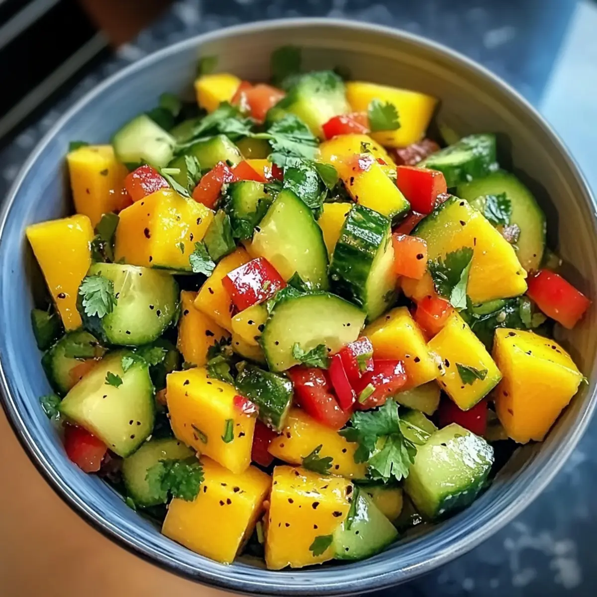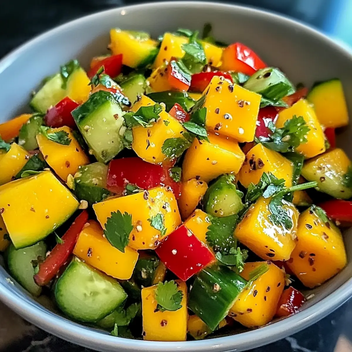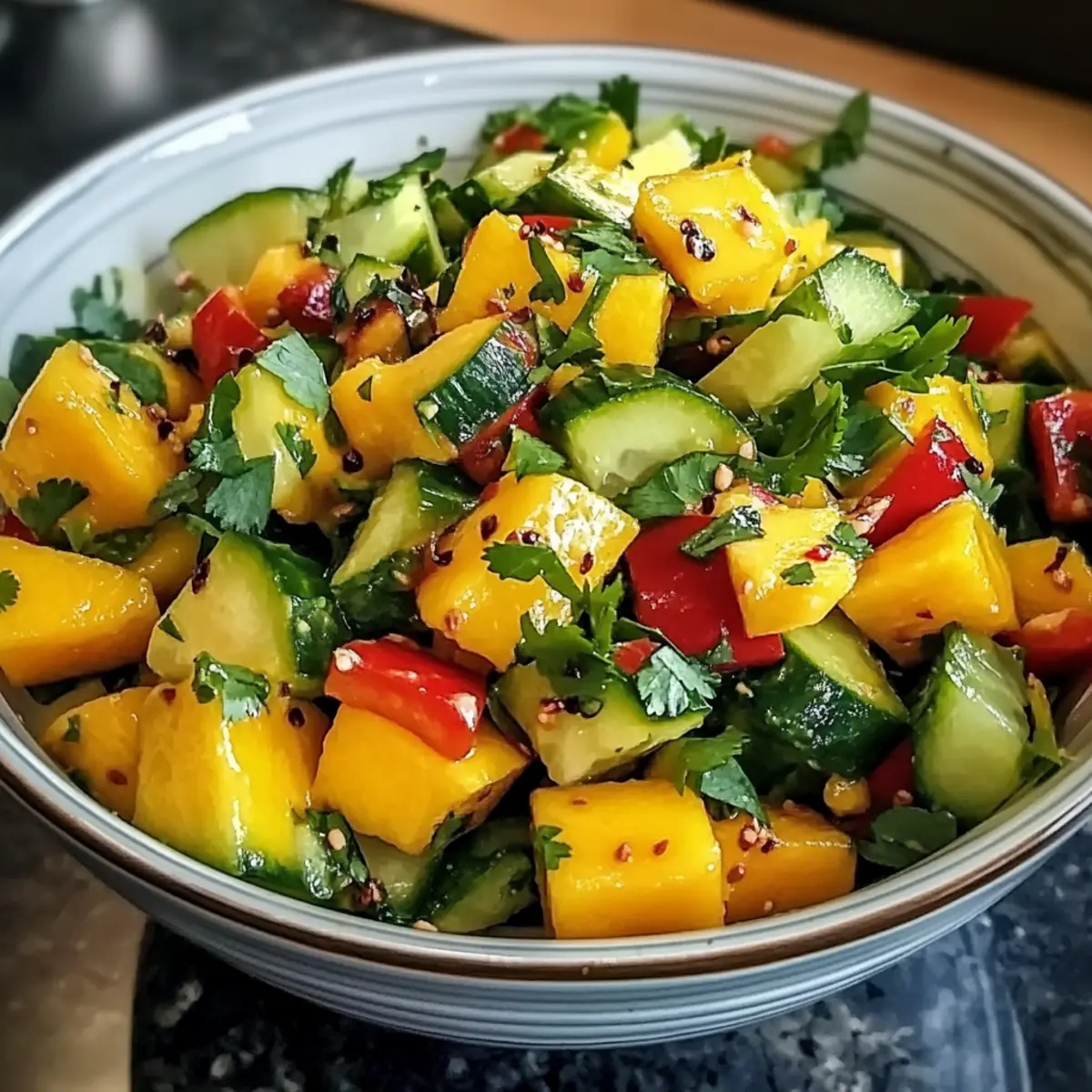 Wenn ich an frische, lebendige Geschmäcker denke, führt mich mein Weg oft in die thailändische Küche. Besonders dieser Thai Mango Gurkensalat ist für mich wie ein Kurzurlaub in die Tropen, ohne das Haus verlassen zu müssen. Die Kombination aus saftigen, reifen Mangos und knusprigen Gurken ist nicht nur ein optischer Genuss – sie bietet auch eine erfrischende Auszeit an heißen Tagen. Und das Beste daran? Dieses Rezept ist absolut unkompliziert: In nur 15 Minuten ist diese gesunde, vegane Mahlzeit zubereitet und perfekt für alle, die sich von Fast Food verabschieden möchten. Ob als leichtes Mittagessen oder als bunte Beilage zu gegrilltem Fleisch – dieser Salat bringt fröhliche Farben und Geschmack auf den Tisch. Bist du bereit, mit mir dieses erfrischende Rezept auszuprobieren? Warum ist dieser Salat ein Must-Have? Erfrischend, dieser Thai Mango Gurkensalat bringt das Beste aus frischen Zutaten auf Ihren Tisch. Schnell und einfach, in nur 15 Minuten zubereitet, ist er die perfekte Lösung für alle, die gesunde Mahlzeiten ohne Aufwand lieben. Veganfreundlich, können Sie ihn auch mit Sojasauce anpassen, um ein tolles pflanzliches Gericht zu kreieren. Farbenfroh und appetitlich, die Mischung aus leuchtendem Mango und knackiger Gurke lässt Ihr Essen nicht nur köstlich schmecken, sondern auch phänomenal aussehen – ideal für Partys und Familienessen. Genießen Sie auch die Variationsmöglichkeiten, indem Sie frische Früchte wie Ananas hinzugefügt oder ihn zu Thai-Currys kombinieren! Thai Mango Gurkensalat Zutaten • Dieser Salat ist nicht nur köstlich, sondern auch einfach zuzubereiten. Für den Salat Mango – liefert eine süße, saftige Note; verwenden Sie reife Mango für den besten Geschmack. Gurke – sorgt für einen erfrischenden Crunch; eine englische Gurke kann mit der Schale verwendet werden. Rote Paprika – bringt Farbe und Süße ins Spiel; in mundgerechte Stücke schneiden. Rote Zwiebel – für einen milden Zwiebelgeschmack; dünn geschnitten bleibt der Geschmack dezent. Frischer Koriander – fügt eine frische, kräuterige Note hinzu; fein hacken für den besten Geschmack. Für das Dressing Limettensaft – bringt Säure und verleihen Frische; frisch gepresst ist am besten. Fischsauce – sorgt für eine umami Tiefe (für eine vegane Variante, durch Sojasauce ersetzen). Honig – fügt süße Akzente hinzu; nach Geschmack anpassen. Chili-Flocken – bringen eine angenehme Schärfe; je nach Vorliebe anpassen. Genießen Sie diesen Thai Mango Gurkensalat als erfrischende Mahlzeit oder bunte Beilage – gesund und schnell hergestellt! Step-by-Step Instructions für Thai Mango Gurkensalat Step 1: Mango und Gurke vorbereiten Beginnen Sie, indem Sie die reifen Mangos schälen und in kleine Würfel schneiden. Verwenden Sie eine scharfe Messer, um die perfekte Konsistenz zu erreichen. Nehmen Sie dann die englische Gurke, lassen Sie die Schale dran, und schneiden Sie sie ebenfalls in Würfel. Die Farben und Texturen sollten lebhaft und einladend sein. Step 2: Paprika und Zwiebel schneiden Schneiden Sie nun die rote Paprika in kleine Mundstücke. Diese bringt Süße und Farbe in Ihren Thai Mango Gurkensalat. Nehmen Sie anschließend die rote Zwiebel, schneiden Sie sie dünn und lassen Sie die milden Aromen durch den feinen Schnitt entfalten. Legen Sie all diese Zutaten in eine große Schüssel. Step 3: Koriander hinzufügen Jetzt ist es Zeit, frischen Koriander hinzuzufügen. Hacken Sie die Blätter fein, um deren intensive Aromen freizusetzen. Geben Sie den Koriander in die Schüssel zu den anderen vorbereiteten Zutaten. Achten Sie darauf, alles gleichmäßig zu verteilen, sodass jede Biss eine frische Note trägt. Step 4: Dressing anrühren In einer separaten Schüssel kombinieren Sie frisch gepressten Limettensaft, Fischsauce (oder Sojasauce für die vegane Variante), Honig und Chili-Flocken. Rühren Sie mit einem kleinen Schneebesen oder einer Gabel, bis der Honig vollständig aufgelöst ist. Das Dressing sollte gut ausgewogen und aromatisch duften. Step 5: Zutaten kombinieren Gießen Sie das Dressing über die vorbereiteten Zutaten in der großen Schüssel. Verwenden Sie eine große Gabel oder einen Löffel, um alles sanft zu vermengen, ohne die Mango-Stücke zu zerdrücken. Die Farben sollten lebhaft miteinander verschmelzen und ein einladendes Bild abgeben. Step 6: Ruhen lassen Lassen Sie den Salat für etwa 10 Minuten ruhen. Dies ermöglicht den Aromen, sich gut zu verbinden und intensivieren. Stellen Sie die Schüssel an einen kühlen Ort, damit die frischen Zutaten weiterhin ihre Knackigkeit bewahren. Step 7: Servieren Servieren Sie den Thai Mango Gurkensalat entweder kühl oder bei Raumtemperatur. Optional können Sie mit frischem Koriander garnieren, um das Gericht zusätzlich zu verfeinern. Bereiten Sie sich darauf vor, einen erfrischenden und gesunden Genuss zu erleben! Variationen & Substitutionen für Thai Mango Gurkensalat Entdecke, wie einfach es ist, deinen Thai Mango Gurkensalat individuell anzupassen und neue Geschmackserlebnisse zu kreieren! Vegan: Ersetze die Fischsauce durch Sojasauce oder Tamari für eine köstliche vegane Variante, die den umami Geschmack beibehält. Fruchtige Note: Füge gewürfelte Ananas, Kiwi oder Erdbeeren hinzu, um dem Salat eine süße, fruchtige Wendung zu geben. Diese frischen Zutaten bringen zusätzlichen Glanz und Geschmack. Exotische Nüsse: Streue gehackte Erdnüsse oder Cashews über den Salat, um ihm einen knackigen Biss und nussige Aromen zu verleihen. So wird der Salat noch sättigender! Kräutervielfalt: Variiere mit frischer Minze oder Basilikum, um eine neue, aromatische Dimension zu schaffen. Die verschiedenen Kräuter sorgen dafür, dass jeder Biss spannend bleibt. Schärfe anpassen: Erhöhe den Schärfegrad mit frischem gehackten Chili oder einer Prise mehr Chili-Flocken, wenn du es richtig würzig magst. So wird der Salat lebhaft und aufregend. Cremige Variante: Mische in das Dressing einen Löff