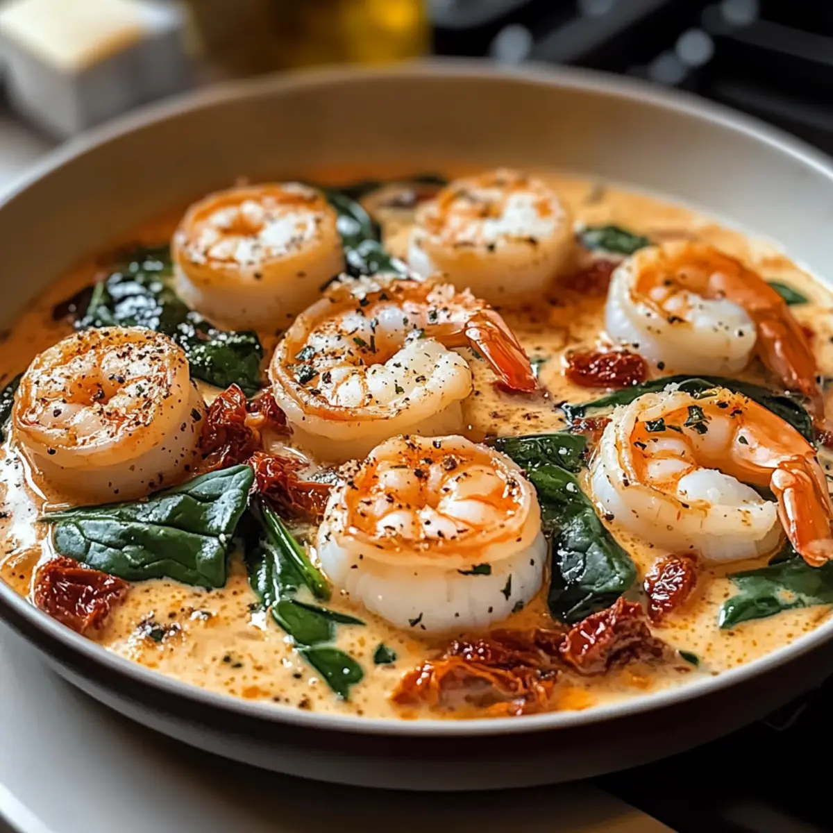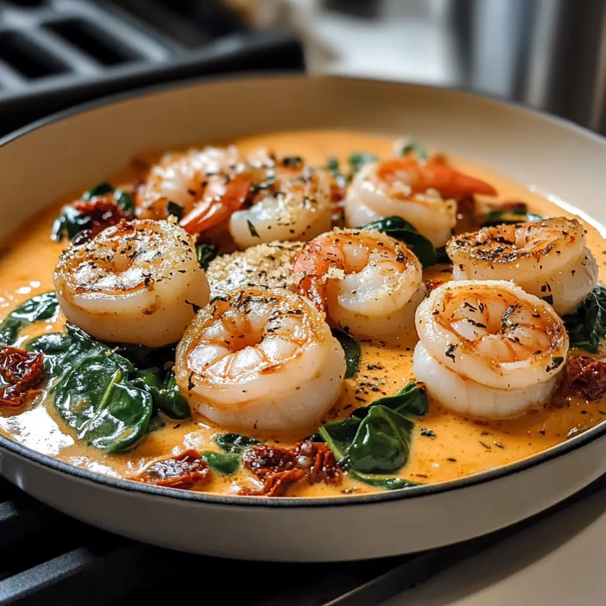Inmitten eines hektischen Alltags, in dem wir oft zu schnellen, ungesunden Mahlzeiten greifen, gibt es Nächte, an denen man sich zurücklehnen und eine köstliche Gourmet-Erfahrung gönnen möchte. Heute präsentiere ich euch meine Version von Toskanischen Garnelen und Jakobsmuscheln, die selbst in der knappen Zeit von unter 20 Minuten ein wahres Fest für die Geschmacksknospen bietet. Mit einer cremigen Sauce aus sonnengetrockneten Tomaten und aromatischem Knoblauch ist dieses Gericht nicht nur eine schnelle Lösung für die Abendroutine, sondern auch eine gesunde Wahl, da es proteinreich und kohlenhydratarm ist. Ideal für ein gemütliches Dinner mit Freunden oder ein romantisches Abendessen, was könnte besser sein? Lasst uns gemeinsam dieses kulinarische Abenteuer starten! Warum wirst du dieses Rezept lieben? Einfachheit: Mit nur wenigen Zutaten und einer klaren Anleitung ist dieses Gericht schnell zubereitet und erfordert keine aufwendigen Kochkünste. Reiche Aromen: Die Kombination aus Knoblauch, sonnengetrockneten Tomaten und cremiger Sauce verleiht diesem Gericht einen unvergesslichen Geschmack. Flexibilität: Ob mit Garnelen, Jakobsmuscheln oder auch Hähnchen – du kannst dieses Rezept nach Lust und Laune anpassen. Vielleicht mit etwas Gemüse wie Spargel für zusätzlichen Geschmack und Nährstoffe? Schnell und nahrhaft: In weniger als 20 Minuten hast du eine proteinreiche, kohlenhydratarme Mahlzeit, die nicht nur sättigend, sondern auch gesund ist. Perfekt für besondere Anlässe: Dieses Gericht sieht nicht nur toll aus, es begeistert auch deine Gäste und sorgt für einen Wow-Effekt bei jedem Dinner. Du kannst auch unsere anderen leckeren Rezepte ausprobieren, wie die Knusprige Garnelen Spargel oder den Mediterranen Orzo Gesunden Salat für noch mehr Abwechslung in deiner Küche! Toskanische Garnelen und Jakobsmuscheln Zutaten • Entdecke die Geheimnisse für ein einfaches, aber elegantes Gericht. Für die Meeresfrüchte: 1 Pfund Große Garnelen – Die Hauptproteinquelle; für Bequemlichkeit geschält und entdarmt verwenden. 1 Pfund Jakobsmuscheln – Fügt Reichtum und einen Gourmet-Touch hinzu; vor dem Anbraten trocken tupfen. Für die Sauce: 3-4 Zehen Knoblauch – Für den Geschmack; fein gehackt für ein gleichmäßiges Aroma. 1 Tasse Schlagsahne – Basis der Sauce, die Cremigkeit verleiht; Halbfett-Sahne kann als Ersatz verwendet werden. 1/2 Tasse Geriebener Parmesan – Sorgt für Tiefe und Umami-Geschmack; frisch gerieben wird empfohlen. 1/2 Tasse Sonnengetrocknete Tomaten – Verleiht einen würzigen und reichhaltigen Geschmack, der für das toskanische Profil unerlässlich ist; ölverpackte oder rehydrierte verwenden. 1 Esslöffel Italienische Gewürzmischung – Eine Mischung aus Kräutern zur Geschmacksverstärkung; kann Basilikum, Oregano und Thymian enthalten. Für die Gemüsebeilage: 2 Tassen Babyspinat – Blattgemüse, das Nährstoffe und Farbe hinzufügt; Grünkohl ist eine gute Alternative. Sonstiges: 2 Esslöffel Olivenöl – Zum Braten der Meeresfrüchte und Sautieren; Butter kann für einen reichhaltigeren Geschmack verwendet werden. Nach Geschmack Salz und Pfeffer – Für die Würze; wichtig für die Geschmacksoptimierung. Rote Paprikaflocken (optional) – Für etwas Schärfe; nach Geschmack anpassen. Mit diesen Zutaten zauberst du im Handumdrehen das köstliche Rezept für Toskanische Garnelen und Jakobsmuscheln! Schritt-für-Schritt-Anleitung für Toskanische Garnelen und Jakobsmuscheln Step 1: Olivenöl erhitzen In einer großen Pfanne das Olivenöl bei mittlerer Hitze für etwa 2 Minuten erhitzen, bis es leicht schimmert. Achte darauf, dass das Öl nicht zu heiß wird, da wir die Jakobsmuscheln gleich darin anbraten werden. Eine große Pfanne sorgt dafür, dass genügend Platz für alle Zutaten ist, um gleichmäßig zu garen. Step 2: Jakobsmuscheln anbraten Die Jakobsmuscheln gründlich trocken tupfen und für 2-3 Minuten auf jeder Seite anbraten, bis sie goldbraun sind. Verwende eine Zange, um sie vorsichtig zu wenden und ein gleichmäßiges Bräunungsergebnis zu erzielen. Nach dem Anbraten die Jakobsmuscheln aus der Pfanne nehmen und beiseite stellen. Step 3: Knoblauch sautieren Im verbliebenen Öl den fein gehackten Knoblauch 30 Sekunden lang anbraten, bis er duftet. Dabei die braunen Reste vom Boden der Pfanne mit einem Holzlöffel lösen, um den köstlichen Geschmack einzufangen. Achte darauf, dass der Knoblauch nicht verbrennt, da er sonst bitter wird. Step 4: Sahne hinzufügen Nun die Schlagsahne in die Pfanne einrühren und zum sanften Köcheln bringen. Halte die Hitze niedrig und beobachte, dass sich kleine Bläschen bilden, ohne dass die Sahne sprudelnd kocht. Dies ist der perfekte Zeitpunkt, um die cremige Basis für die Toskanische Garnelen und Jakobsmuscheln zu schaffen. Step 5: Tomaten und Gewürze integrieren Füge die Sonnengetrockneten Tomaten und die italienische Gewürzmischung hinzu. Rühre alles gut um und lasse die Mischung weitere 2-3 Minuten sanft köcheln, damit die Aromen sich perfekt verbinden. Der Duft wird intensiv und verführerisch sein – ein Zeichen, dass das Gericht auf dem besten Weg ist. Step 6: Garnelen und Spinat hinzufügen Jetzt die geschälten Garnelen und den Babyspinat in die Pfanne geben. Die Garnelen sollten innerhalb von 3-4 Minuten garen, bis sie rosa sind und der Spinat zusammenfällt. Rühre gelegentlich um, damit alles gleichmäßig gart und der Spinat schön zusammenfällt. Step 7: Jakobsmuscheln und Käse dazugeben Die zuvor gebratenen Jakobsmuscheln wieder in die Pfanne legen und mit dem geriebenen Parmesan bestreuen. Sanft umrühren und alles für eine weitere Minute erwärmen, bis der Käse schmilzt und eine köstliche, cremige Sauce entsteht. Diese finale Berührung sorgt für zusätzlichen Geschmack und eine wunderschöne Präsentation. Step 8: Anrichten und servieren Diese Toskanischen Garnelen und Jakobsmuscheln nun auf Teller ladeln und nach Belieben mit zusätzlichem Parmesan ga