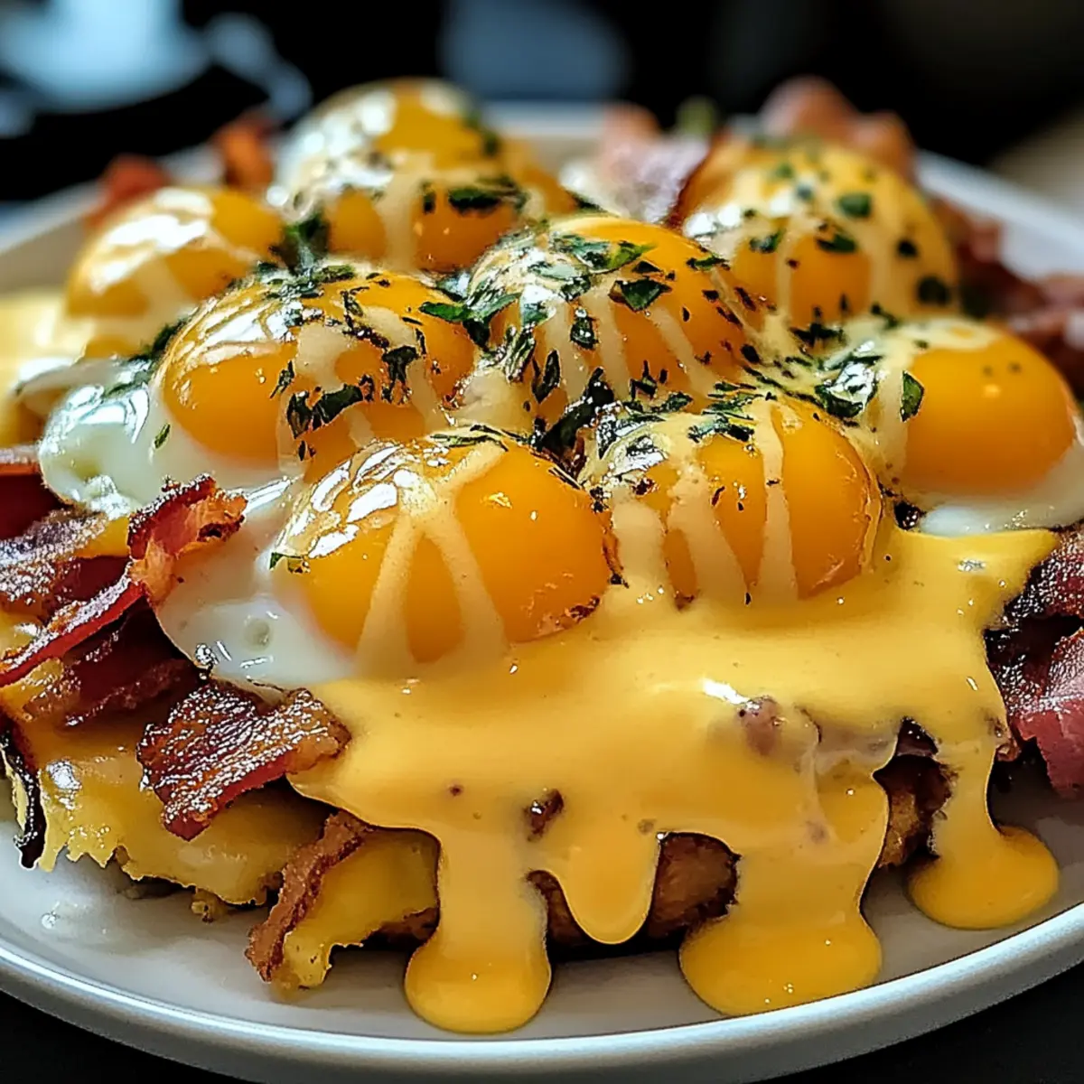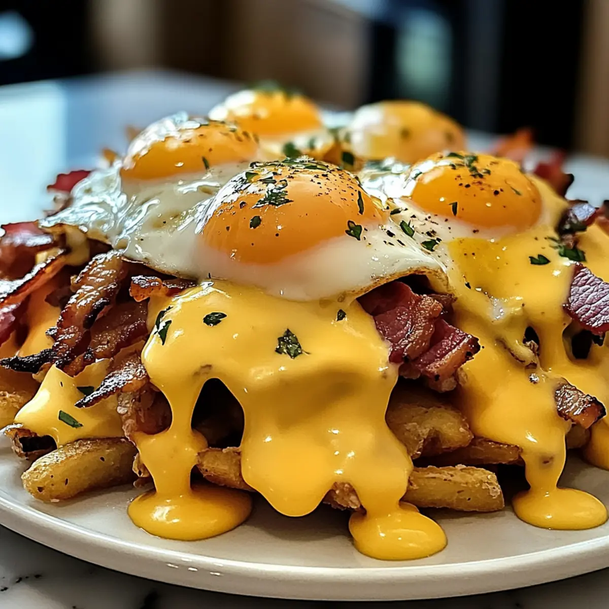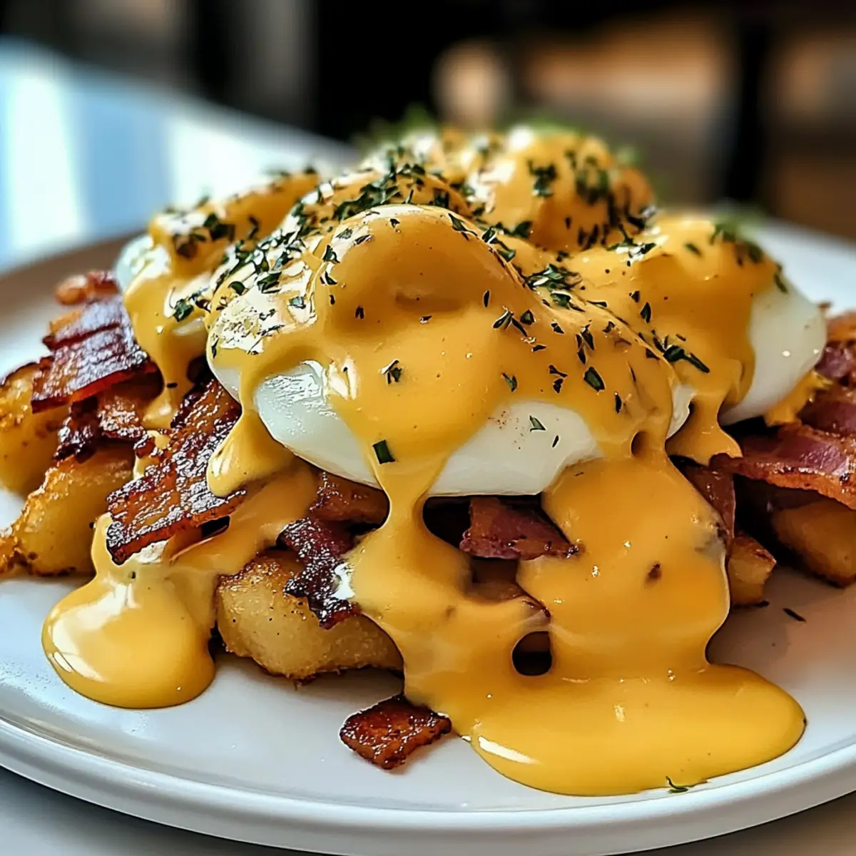 Eines der besten Frühstückserlebnisse, die ich je hatte? Die Kombination von knusprigen Hash Browns, würzigem Rinder-Bacon und einer samtigen Hollandaise, die über allem thront. Mit dieser ultimativen Frühstücks-Poutine mit samtiger Sauce Hollandaise wird dein morgendliches Essen zum Fest! Dieses Rezept vereint komfortables Essen und kreative Freiheit, denn es lässt sich leicht anpassen, egal ob du Käsevariationen ausprobierst oder eine vegetarische Option wählst. In weniger als einer Stunde kannst du ein herzhaftes Brunchgericht zaubern, das selbst die anspruchsvollsten Esser begeistert. Wie findest du die Idee, dein Frühstück in ein zauberhaftes, gehaltvolles Gericht zu verwandeln? Warum wirst du dieses Rezept lieben? Einfachheit: Der gesamte Prozess ist unkompliziert, sodass selbst Küchen-Neulinge in weniger als einer Stunde ein köstliches Gericht zaubern können. Herzhafter Geschmack: Die Kombination aus knusprigen Hash Browns, würzigem Rinder-Bacon und einer cremigen Hollandaise sorgt für ein Geschmackserlebnis, das deine Geschmacksnerven verwöhnt. Vielseitig: Du kannst dieses Rezept anpassen – probiere verschiedene Käsesorten oder füge für eine vegetarische Variante Tempeh-Bacon hinzu. Perfekte Brunch-Option: Ideal für gesellige Zusammenkünfte, wird diese Poutine alle Gäste begeistern und gibt deinem Brunch ein besonderes Flair. Zufriedenheitsgarantie: Jeder Bissen ist ein kleiner Festschmaus, der dich und deine Lieben immer wieder dazu einlädt, dieses Gericht zu genießen. Ultimative Frühstücks-Poutine Zutaten • Hinweis: Hier sind die wichtigen Zutaten, die du für die Zubereitung deiner ultimativen Frühstücks-Poutine mit samtiger Sauce Hollandaise benötigst. Für die Hash Browns Gefrorene Hash Browns – Stellen die Basis dar und müssen knusprig sein für die richtige Textur. Du kannst auch selbstgemachte Hash Browns verwenden, um einen frischeren Geschmack zu erzielen. Olivenöl – Sorgt für Knusprigkeit und Geschmack. Kann durch jedes hitzebeständige Öl ersetzt werden. Salz – Verbessert den Geschmack; nach Belieben anpassen. Unverzichtbar für die Würze. Schwarzer Pfeffer – Fügt Würze hinzu; optional für etwas Schärfe. Kann weggelassen werden, wenn kein Pfeffer gewünscht ist. Für den Belag Rinder-Bacon – Bietet herzhaften Reichtum und Knusprigkeit. Ersetze ihn durch Truthahn-Bacon oder Wurst für einen anderen Geschmack. Geriebener Cheddar Käse – Schmilzt gut und bringt Cremigkeit. Zögere nicht, ihn durch andere schmelzbare Käsesorten zu ersetzen. Geriebener Mozzarella Käse – Sorgt für eine zähe Textur. Provenzalischer Käse oder Fontina sind ebenfalls Möglichkeiten. Soße – Fügt Reichhaltigkeit hinzu und verbindet das Gericht. Verwende hausgemachte oder gekaufte Soße für Bequemlichkeit. Für die Hollandaise Ungesalzene Butter – Wichtig für die Cremigkeit der Hollandaise. Muss ungesalzen sein, um die Würze besser zu kontrollieren. Eidotter – Grundlage für die Hollandaise; essenziell für die Konsistenz. Keine direkte Alternative verfügbar. Dijon-Senf – Fügt der Hollandaise Würze hinzu; optional, aber empfehlenswert. Kann durch andere Senfsorten ersetzt werden, wenn nötig. Apfelessig – Sorgt für die Säure; kann durch weißen Weinessig ersetzt werden. Beide verstärken das Aroma. Zitronensaft – Bringt Frische in den Geschmack; kann auch durch Limettensaft ersetzt werden. Frisch ist für die besten Ergebnisse empfohlen. Cayenne Pfeffer – Fügt einen Hauch von Schärfe hinzu; nach Belieben anpassen oder weglassen. Optional, je nach Vorliebe für Gewürz. Für das Topping Frische Schnittlauch oder Petersilie – Zum Garnieren; bringt Frische und Farbe. Du kannst auch andere frische Kräuter wie Dill verwenden, wenn gewünscht. Die Zutaten für die ultimative Frühstücks-Poutine mit samtiger Sauce Hollandaise sind bereit, und bald kannst du dich auf ein geschmackliches Fest freuen! Schritt-für-Schritt-Anleitung für die Ultimative Frühstücks-Poutine mit samtiger Sauce Hollandaise Step 1: Hash Browns zubereiten Heize den Ofen auf 220 °C vor. Vermische die gefrorenen Hash Browns in einer Schüssel mit Olivenöl, Salz und Pfeffer, bis sie gut bedeckt sind. Breite die Hash Browns gleichmäßig auf einem Backblech aus und backe sie für 20-30 Minuten. Wende sie nach der Hälfte der Zeit, bis sie goldbraun und knusprig sind. Step 2: Rinder-Bacon garen Während die Hash Browns im Ofen sind, lege den Rinder-Bacon auf ein mit Alufolie ausgelegtes Backblech. Backe den Bacon bei 200-220 °C für etwa 15-20 Minuten, bis er knusprig und gut durchgegart ist. Achte darauf, ihn gelegentlich zu überprüfen, um ein Überkochen zu vermeiden. Step 3: Hollandaise-Sauce zubereiten Setze einen Wasserbad auf, indem du einen Topf mit Wasser erhitzt, ohne es zum Kochen zu bringen. In einer Schüssel werden die Eigelbe, Dijon-Senf, Apfelessig und Zitronensaft gut verquirlt. Stelle die Schüssel über das simmernde Wasser und schlage die Mischung 3-5 Minuten lang, bis sie dicklich wird. Füge langsam die geschmolzene Butter hinzu, während du weiter rührst, bis die Sauce samtig ist. Step 4: Eier pochieren Fülle einen mittelgroßen Topf mit Wasser und füge einen Spritzer Essig hinzu. Erhitze das Wasser, bis es sanft köchelt. Schlage die Eier vorsichtig in kleine Schalen und lasse sie nacheinander in das Wasser gleiten. Poche die Eier für 3-4 Minuten, bis das Eiweiß fest und das Eigelb noch flüssig ist. Hebe sie vorsichtig mit einem Schaumlöffel heraus. Step 5: Poutine anrichten Sobald alles zubereitet ist, lass die Kreativität spielen! Verteile die knusprigen Hash Browns gleichmäßig auf die Teller. Streue Geriebenen Cheddar und Mozzarella über die Hash Browns, gefolgt von einer großzügigen Portion Soße. Träufle die Hollandaise über die warme Poutine, belege sie mit dem knusprigen Rinder-Bacon und setze vorsichtig die pochierten Eier darauf. Garniere alles mit frischem Schnittlauch oder Petersilie für zu