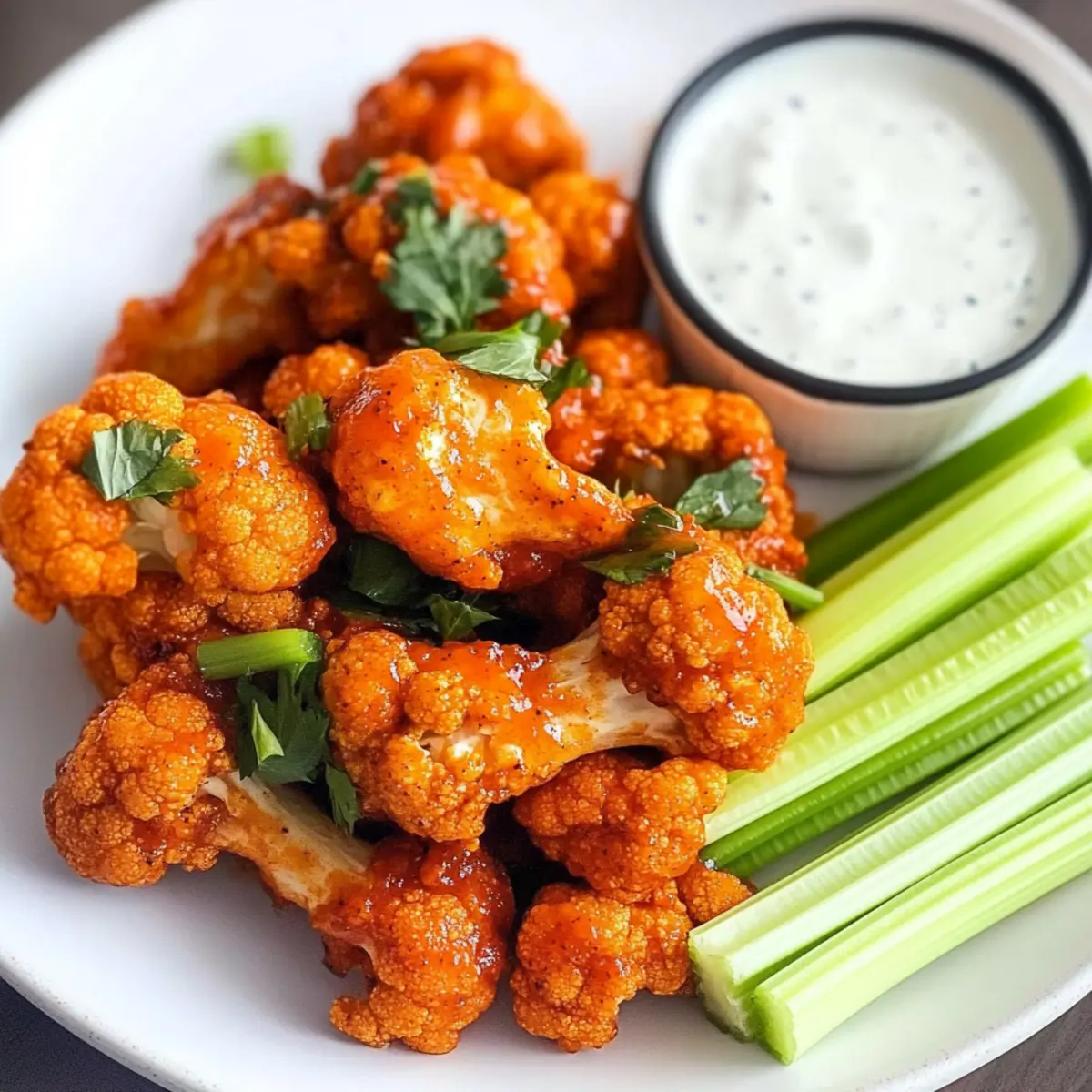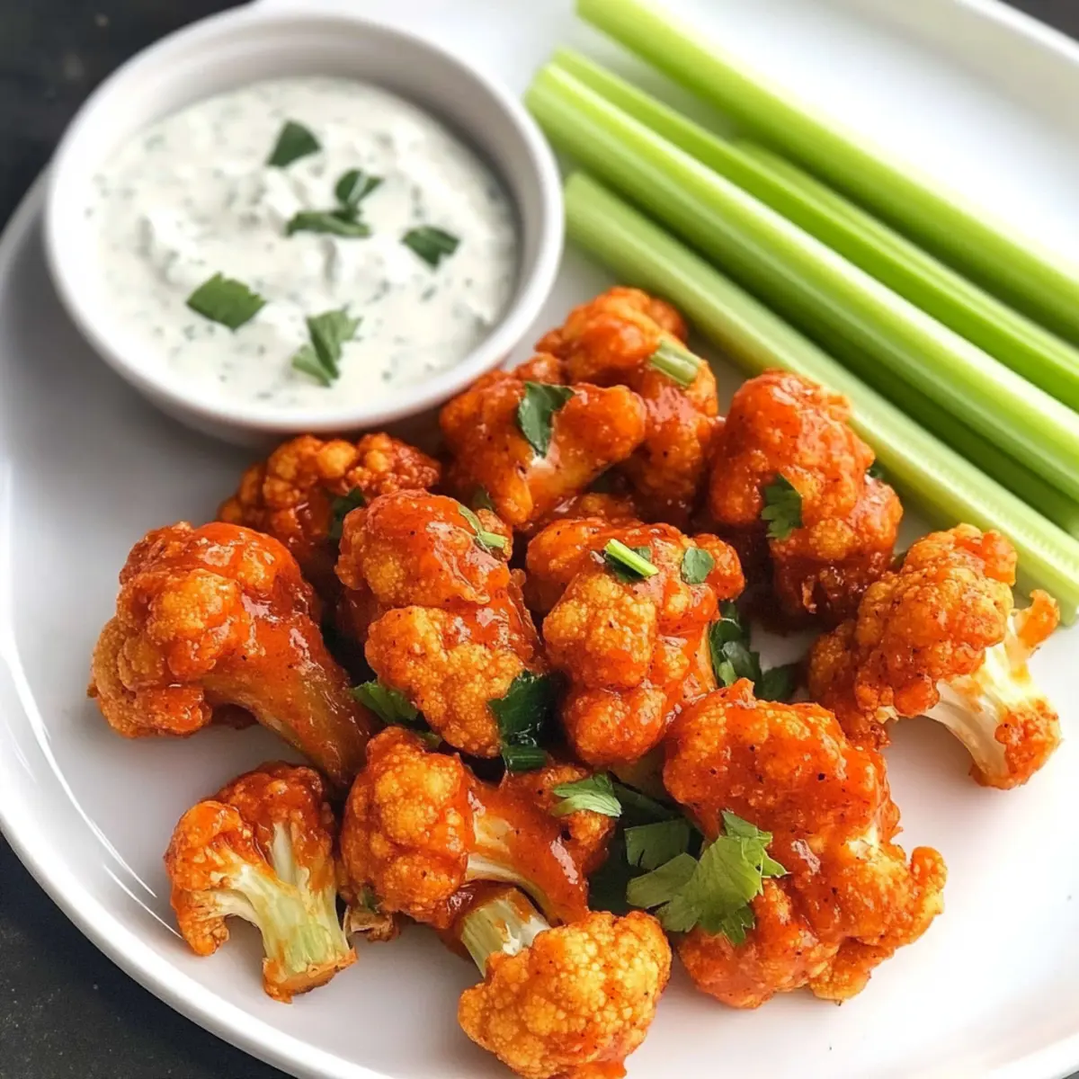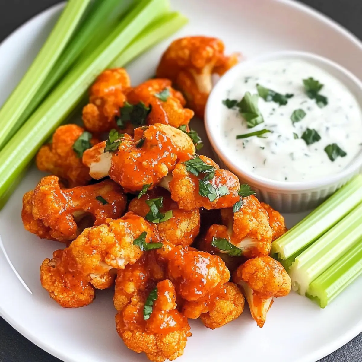 Als ich zum ersten Mal die knackigen Veganen Buffalo Blumenkohlflügel zubereitete, war ich sofort begeistert von der Vielfalt an Geschmäckern und der Textur, die aus diesen kleinen Röschen erwächst. Die Kombination aus der knusprigen Panade und dem zarten Blumenkohlinneren ist einfach unwiderstehlich! Diese köstlichen Flügel sind nicht nur ein gesundes und glutenfreies Häppchen, sondern auch ein echtes Highlight für jede Party. Ganz gleich, ob du sie im Air Fryer oder im Ofen zubereitest, sie sind in kürzester Zeit bereit und versprechen ein Geschmackserlebnis, das jeden begeistert – einschließlich der Fleischliebhaber! Bist du bereit, dich in die Welt dieser pflanzlichen Köstlichkeit zu stürzen? Warum sind diese Blumenkohlflügel ein Hit? Einzigartig und lecker: Diese veganen Buffalo Blumenkohlflügel sind die perfekte Kombination aus knuspriger Panade und zartem Blumenkohl, die nicht nur Vegetarier begeistert. Gesund und glutenfrei: Sie sind eine großartige, gesunde Option für alle, die auf ihre Ernährung achten, ohne auf den Geschmack verzichten zu müssen. Vielfältige Zubereitung: Ob im Air Fryer oder im Ofen – beide Methoden garantieren eine unwiderstehliche Knusprigkeit in kürzester Zeit. Einfach und zeitsparend: Mit nur wenigen Zutaten sind sie schnell zubereitet und ideal für spontane Snacks oder als Partyhit. Für jeden Anlass: Egal, ob beim Filmabend oder beim Grillfest, diese Blumenkohlflügel werden garantiert zum Star deines Buffets! Vegane Buffalo Blumenkohlflügel Zutaten • Diese köstlichen Blumenkohlflügel sind einfach und schnell zuzubereiten – ideal für jeden Anlass! Für die Blumenkohlflügel Blumenkohl – sorgt für die perfekte Basis; benutze einen mittleren Kopf, klein geschnitten in 1-Zoll-Röschen für gleichmäßiges Garen. Buffalo Sauce – fügt Schärfe und Geschmack hinzu; Frank’s Red Hot ist sehr zu empfehlen und kann nach Belieben angepasst werden. Öl (Avocado oder raffiniertes Kokosöl) – hilft, die Knusprigkeit zu gewährleisten und die Aromen aufzunehmen. Für die Panade Mandelsmehl – gibt den Blumenkohlflügeln extra Crunch; kann bei Bedarf durch glutenfreies Mehl ersetzt werden. Knoblauchpulver – verstärkt den herzhaften Geschmack; kann durch frischen Knoblauch ersetzt werden, wenn gewünscht. Meersalz – balanciert die Aromen; nach Geschmack anpassen. Für die Dipsauce Dipsauce (Ranch oder Blauschimmelkäse) – ergänzt die würzigen Flügel; wähle eine vegane Alternative für eine vollständig pflanzliche Option. Schritt-für-Schritt-Anleitung für Vegane Buffalo Blumenkohlflügel Step 1: Blumenkohl vorbereiten Zuerst den mittleren Kopf Blumenkohl in gleichmäßige 1-Zoll-Röschen schneiden. In einer großen Schüssel das Öl und die Buffalo Sauce vermengen. Dann die Blumenkohlröschen in die Schüssel geben und gründlich durchmischen, bis sie gleichmäßig mit der Sauce bedeckt sind. Achte darauf, dass alle Stücke gut eingekleidet sind. Step 2: Die Panade herstellen In einer separaten Schüssel Mandelsmehl, Knoblauchpulver und Meersalz vermengen. Die Mischung gleichmäßig über die saucierte Blumenkohlmischung streuen und vorsichtig unterheben, um sicherzustellen, dass jede Rösche vollständig mit der Panade bedeckt ist. Dies sorgt für den extra Crunch bei den veganen Buffalo Blumenkohlflügeln. Step 3: Im Air Fryer garen Heize deinen Air Fryer auf 175 °C vor. Lege die Blumenkohlflügel in gleichmäßigen Schichten in den Korb des Air Fryers, achte darauf, sie nicht zu überfüllen. Gare sie 5 Minuten lang, dann schütteln und für weitere 5-7 Minuten backen, bis sie goldbraun und knusprig sind. Überprüfe sie regelmäßig, um sicherzustellen, dass sie nicht verbrennen. Step 4: Im Ofen backen Falls du die Blumenkohlflügel im Ofen zubereitest, heize den Ofen auf 200 °C vor. Lege die coated Blumenkohlröschen gleichmäßig auf ein mit Backpapier ausgelegtes Blech. Backe sie für 15 Minuten, wende die Flügel vorsichtig und backe sie dann weitere 15 Minuten, bis sie weich und knusprig sind. Step 5: Warm servieren Die Veganen Buffalo Blumenkohlflügel sofort servieren, idealerweise mit frischen Selleriesticks und deiner Wahl an Dipsauce. Dies sorgt nicht nur für einen tollen Geschmack, sondern auch für einen knusprigen Biss, der jedes Party-Buffet bereichert. Meal Prep für Vegane Buffalo Blumenkohlflügel Diese Veganen Buffalo Blumenkohlflügel sind ideal für die Vorbereitung, um Zeit an stressigen Wochentagen zu sparen! Du kannst die Blumenkohlröschen bis zu 24 Stunden im Voraus vorbereiten, indem du sie in der Buffalo-Sauce und dem Öl marinierst. Einfach in einem verschlossenen Behälter im Kühlschrank aufbewahren, um die Aromen zu intensivieren. Zudem kann die Panade (Mandelsmehl, Knoblauchpulver und Salz) ebenfalls vorab gemischt und in einem luftdichten Behälter für bis zu 3 Tage aufbewahrt werden. Wenn du bereit bist zu servieren, heize einfach den Air Fryer oder Ofen vor und gare die Blumenkohlflügel wie gewohnt. So hast du immer einen leckeren, gesunden Snack griffbereit, der ebenso knusprig und schmackhaft bleibt! Vegane Buffalo Blumenkohlflügel Varianten Lass deiner Kreativität freien Lauf und passe diese köstlichen Blumenkohlflügel nach deinem Geschmack an! Milder Geschmack: Ersetze die Buffalo Sauce durch Barbecue Sauce für eine weniger scharfe Variante. So kannst du die Flügel auch kleinen Gourmets anbieten. Käse-Alternative: Verwende anstelle von Mandelsmehl Panko-Brösel für einen extra Crunch. Eignet sich perfekt für knusprige Momente! Würzige Note: Füge Paprika oder Cayennepfeffer hinzu, um den Flügeln einen zusätzlichen Kick zu verleihen. Ein kleiner Schuss Extra-Würze, und du bist bereit für das nächste Level. Nährstoffreich: Ergänze den Teig mit einem Schuss Nährhefe, um den Flügeln einen käsigen Geschmack zu verleihen, ganz ohne Milchprodukte. Das macht sie nicht nur lecker, sondern auch nährstoffreicher! Alternative Panade: Verwende glutenfreies Meh