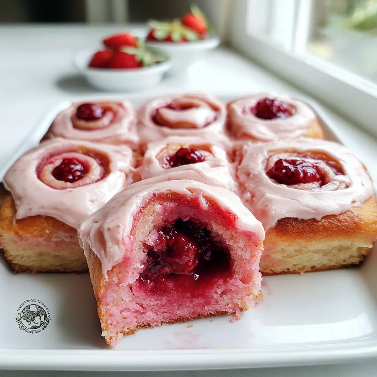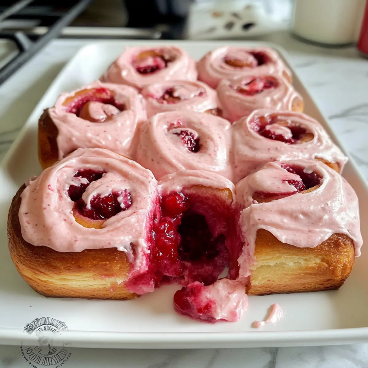 Genieße die leckeren veganen pinken Zimtschnecken, gefüllt mit Himbeerkompott und Erdbeermarmelade – der perfekte pflanzliche Leckerbissen.