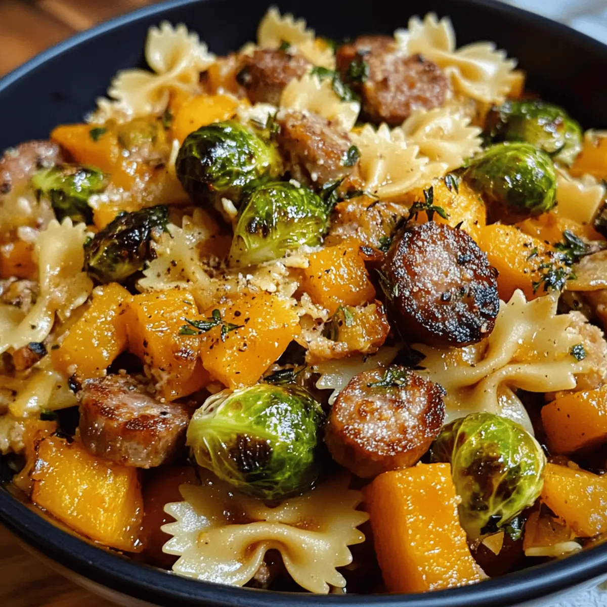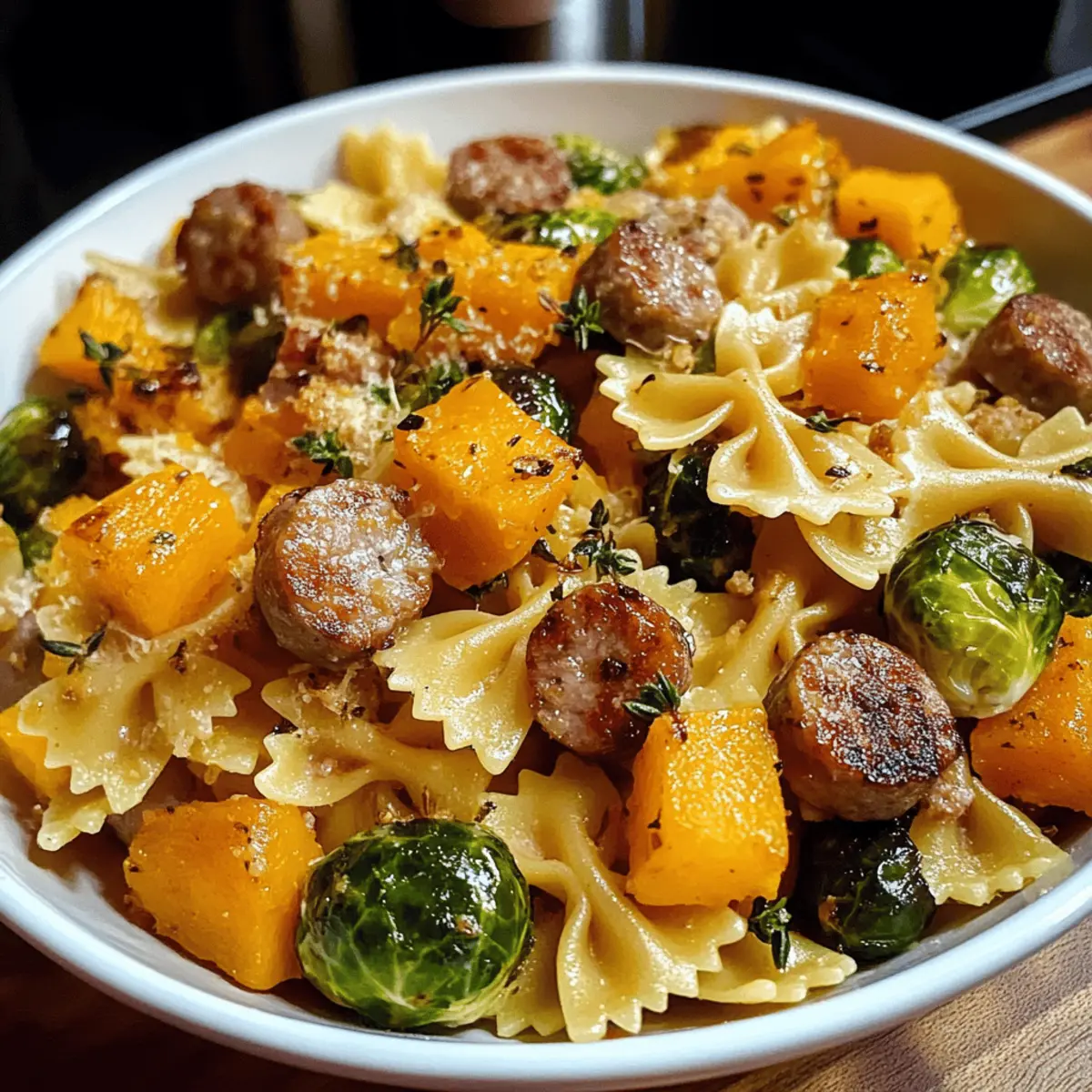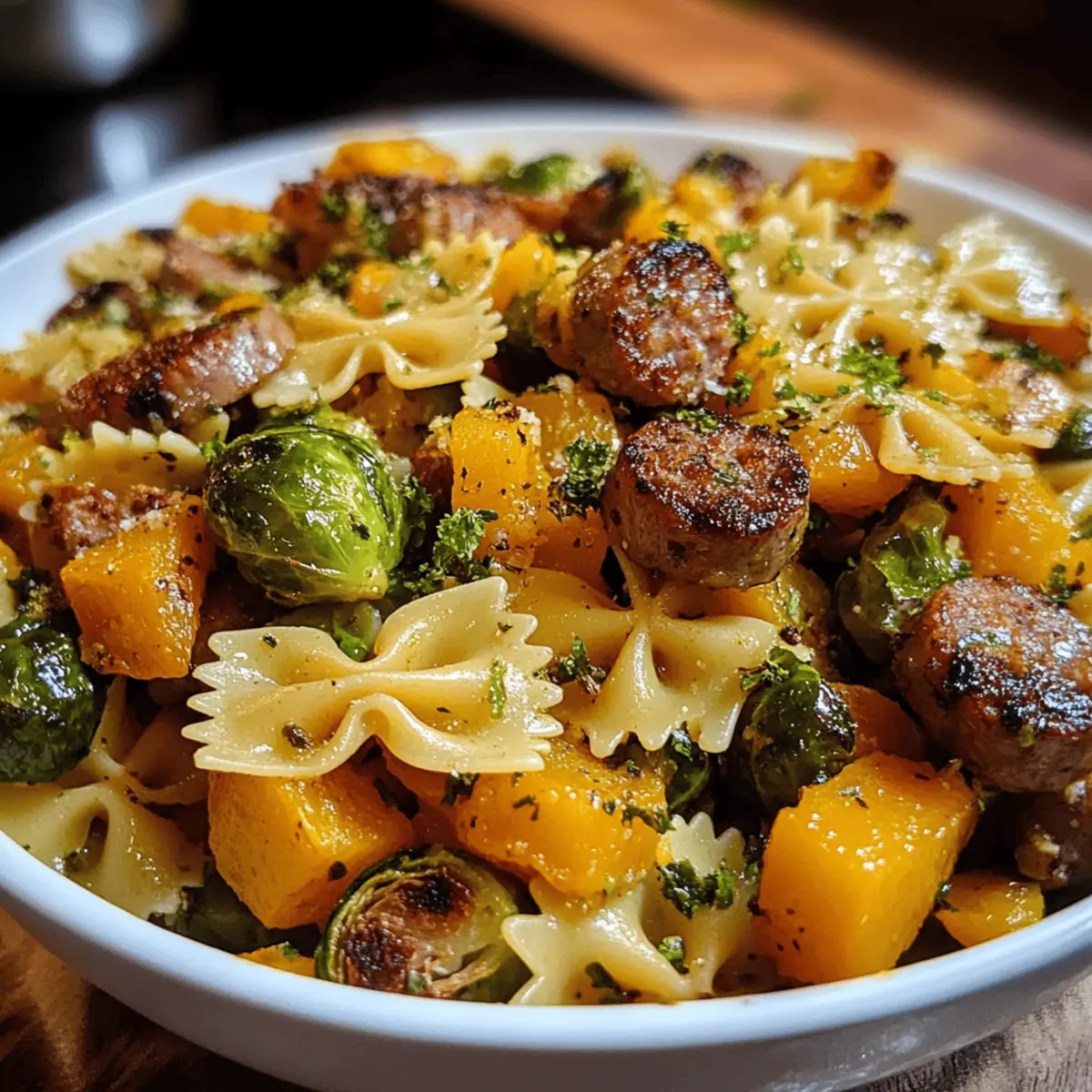 Wurst Pasta Kürbis ist ein schnelles und herzhaftes Herbstgericht, das aus geröstetem Kürbis, würziger Wurst und Schmetterlingsnudeln besteht.