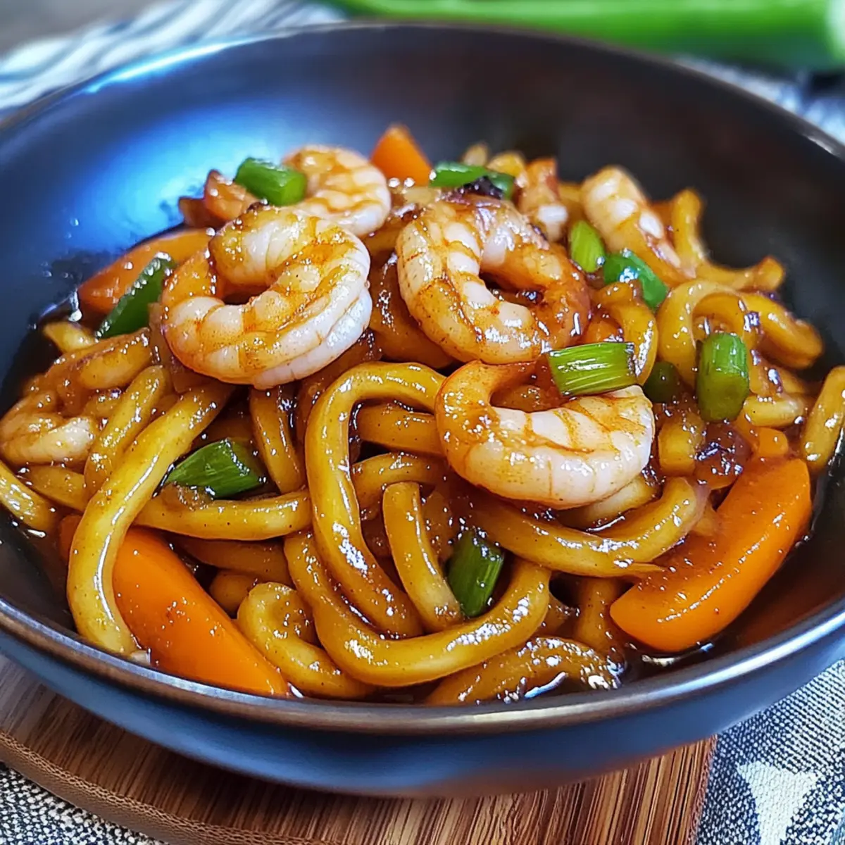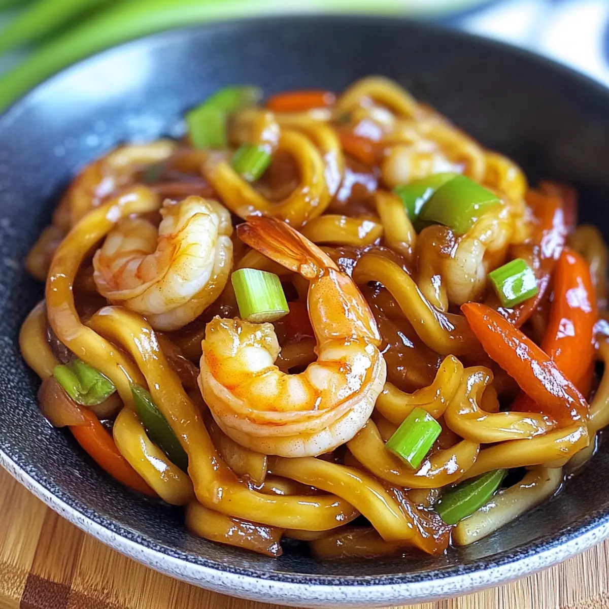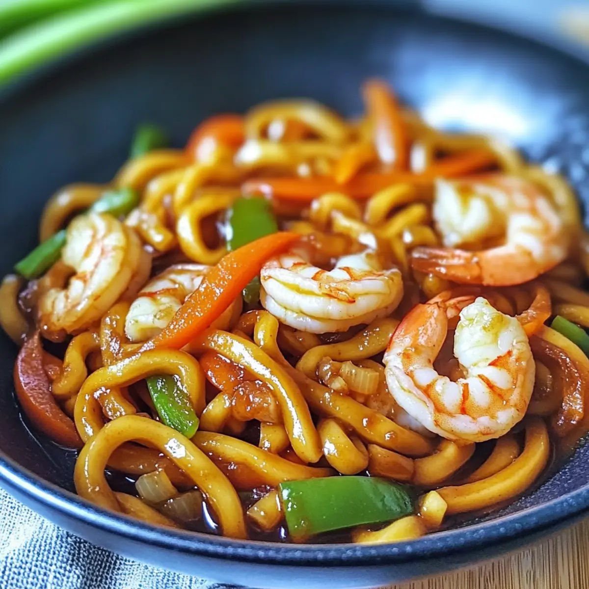 Als ich neulich durch den Supermarkt schlenderte, fiel mir der verlockende Duft von frischem Gemüse und Meeresfrüchten auf—ein perfekter Anlass, um ein köstliches Gericht zu zaubern! Heute teile ich mit euch mein schnelles Rezept für Yaki Udon mit Garnelen in 20 Minuten. Dieses Gericht ist nicht nur ein echter Publikumsmagnet, sondern auch super anpassbar: Ihr könnt nach Belieben eure Lieblingsgemüse und Proteine wie Hühnchen, Rinderfleisch oder Tofu austauschen. In nur 20 Minuten habt ihr eine vollwertige, gesunde Mahlzeit, die nicht nur den Hunger stillt, sondern auch eine gesunde Portion Protein bietet. Seid ihr bereit, bei eurem nächsten Abendessen das kulinarische Ruder zu übernehmen? Warum sind Yaki Udon so beliebt? Schnelligkeit: In nur 20 Minuten zaubert ihr ein köstliches Gericht. Ideal für hektische Abende! Anpassbar: Ihr könnt die Proteine und Gemüse nach Geschmack variieren, was die Möglichkeiten endlos macht. Gesund: Diese Mahlzeit ist reich an Protein und enthält frisches Gemüse, perfekt für eine ausgewogene Ernährung. Ein-Schüssel-Gericht: Weniger Geschirr, mehr Genuss! Alles kommt in einer Schüssel zusammen. Geschmacksexplosion: Die Kombination von Sojasauce, Knoblauch und frischen Zutaten sorgt für einen unvergleichlichen Geschmack. Allgemeine Begeisterung: Jeder liebt es! Ob Familie oder Gäste, Yaki Udon wird garantiert ein Hit. Yaki Udon mit Garnelen Zutaten • Bereit, die Aromen zu entfalten? Hier sind die Zutaten für dein Yaki Udon! Für die Nudeln Udon-Nudeln – Der Hauptbestandteil, der für die köstliche Konsistenz sorgt. Verwende am besten vakuumverpackte Nudeln. Für das Sautieren Neutrales Öl – Zum Anbraten der Zutaten und zum Verhindern des Anhaftens; verwende Sesamöl für zusätzlichen Geschmack. Knoblauch – Für die Basis des herzhaften Geschmacks; frisch gehackter Knoblauch ist ideal. Für das Gemüse Gelbe Zwiebel – Gibt Süße und Tiefe; kann durch Schalotten ersetzt werden. Weiße Champignons – Bringt Umami-Geschmack und Textur; du kannst auch Shiitake oder Cremini verwenden. Karotte – Sorgt für Süße und Farbe; ersetze sie durch Paprika für Variationen. Für das Protein Garnelen – Bieten Protein; achte darauf, dass sie geschält und entdarmt sind. Du kannst sie durch Hühnchen, Rinderfleisch oder Tofu ersetzen. Für die Saucen Reguläre Sojasauce – Für Salzigkeit und Umami; die Menge nach Geschmack anpassen. Austernsauce – Verstärkt die Geschmacksfülle; nutze eine pflanzliche Variante für eine milchfreie Option. Dunkle Sojasauce – Für Farbe und Reichhaltigkeit; ersetze sie bei Bedarf durch mehr reguläre Sojasauce. Reisessig – Sorgt für Säure und Balance; die Menge kann nach Geschmack angepasst werden. Brauner Zucker – Fügt eine süße Note hinzu; du kannst Honig oder Ahornsirup als Ersatz verwenden. Frisch gemahlener schwarzer Pfeffer – Für etwas Schärfe; optional, je nach Vorliebe. Geröstetes Sesamöl – Bringt einen nussigen Geschmack; nur eine kleine Menge am Ende verwenden. Mit diesen Zutaten bereitest du in nur 20 Minuten ein köstliches Yaki Udon mit Garnelen zu! Schritt-für-Schritt-Anleitung für Yaki Udon mit Garnelen in 20 Minuten Step 1: Udon-Nudeln kochen Bringe in einem großen Topf Wasser zum Kochen und füge die Udon-Nudeln hinzu. Koche die Nudeln für 2-3 Minuten, bis sie weich, aber noch bissfest sind. Gieße sie dann ab, spüle sie unter kaltem Wasser, um das Kochen zu stoppen, und gib einen Schuss Öl hinzu, damit sie nicht zusammenkleben. Step 2: Knoblauch anbraten Erhitze in einer großen Pfanne oder einem Wok bei mittlerer bis hoher Hitze etwas neutrales Öl. Füge den frisch gehackten Knoblauch hinzu und brate ihn für etwa 1 Minute, bis er duftet und leicht goldbraun ist. Dies gibt dem Yaki Udon mit Garnelen eine aromatische Basis. Step 3: Champignons garen Gib die geschnittenen Champignons in die Pfanne und brate sie hoch, etwa 3-4 Minuten lang, bis sie weich sind und etwas Farbe angenommen haben. Achte darauf, sie regelmäßig zu wenden, damit sie gleichmäßig garen und ihren Umami-Geschmack entfalten. Step 4: Zwiebeln und Karotten hinzufügen Füge die gewürfelte gelbe Zwiebel und die Karottenstreifen hinzu. Schmecke mit einer Prise Salz ab und koche die Mischung für weitere 2-3 Minuten, bis das Gemüse leicht zart, aber noch knackig ist. So erhält dein Yaki Udon mit Garnelen eine schöne Vielfalt an Texturen. Step 5: Garnelen braten Erhöhe die Hitze und füge die vorbereiteten Garnelen in die Pfanne. Koche sie 2-3 Minuten, bis sie rosa und eben durchgegart sind. Achte darauf, dass du sie nicht überkoche, da sie schnell zu zäh werden können. Gib dann einen Schuss reguläre Sojasauce hinzu, um den Geschmack zu intensivieren. Step 6: Udon-Nudeln einrühren Integriere die vorbereiteten Udon-Nudeln in die Pfanne und rühre alles gut um. Halte die Hitze hoch und brate die Mischung 3-4 Minuten lang, bis die Nudeln gleichmäßig erwärmt und leicht knusprig sind, was ihnen eine köstliche Textur verleiht. Step 7: Sauce hinzufügen Gieße die vorbereitete Sauce aus Austern- und dunkler Sojasauce über die Nudeln. Tossiere alles gut, um sicherzustellen, dass die Nudeln gleichmäßig überzogen sind, und koche für 1-2 Minuten, bis die Sauce leicht eingedickt und aromatisch ist. Step 8: Gemüse zurückgeben Mische das zuvor angebratene Gemüse unter die Nudeln und lasse es für 1-2 Minuten weiterkochen, bis alles gut erhitzt ist. Achte darauf, dass das Gemüse weiterhin seine frische Farbe und Knackigkeit behält, um optimales Aroma und Optik zu gewährleisten. Step 9: Servieren Verteile das Yaki Udon mit Garnelen auf Schalen und garniere es mit frisch gehackten Frühlingszwiebeln. Serviere es sofort heiß, damit jeder die köstlichen Aromen genießen kann. Lagerungstipps für Yaki Udon mit Garnelen Raumtemperatur: Serviere Yaki Udon sofort nach der Zubereitung. Bei Raumtemperatur sollte das Gericht nicht länger als 2 Stunden stehen bleiben. Kühlschrank: Bew