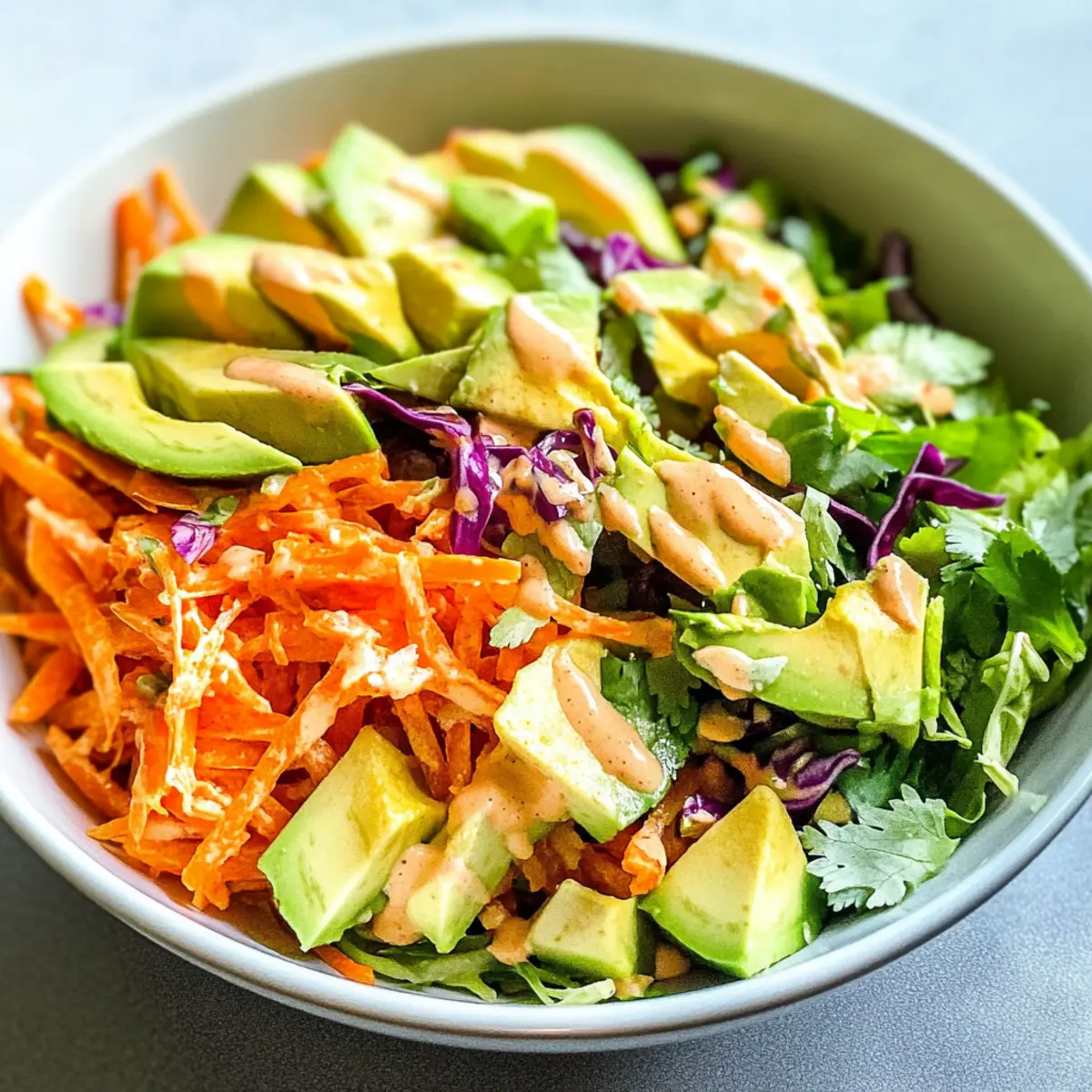Der Zerrissene Thai-Salat mit Avocado ist ideal für Meal Prep und lässt sich hervorragend im Voraus zubereiten! Du kannst alle Gemüsezutaten, wie den grünen Kohl, die Karotten und die Paprika, bis zu 3 Tage im Voraus schneiden und in einem luftdichten Behälter im Kühlschrank aufbewahren, um die Frische zu bewahren. Bereite das Dressing ebenfalls vor und bewahre es bis zur Verwendung separat auf, damit die Aromen sich nicht zu sehr vermischen und der Salat knusprig bleibt. Wenn du bereit bist zu servieren, mische einfach das vorbereitete Gemüse, füge das Dressing hinzu und hebe die Avocado unter. So genießt du auch an hektischen Tagen einen schmackhaften, erfrischenden Salat!