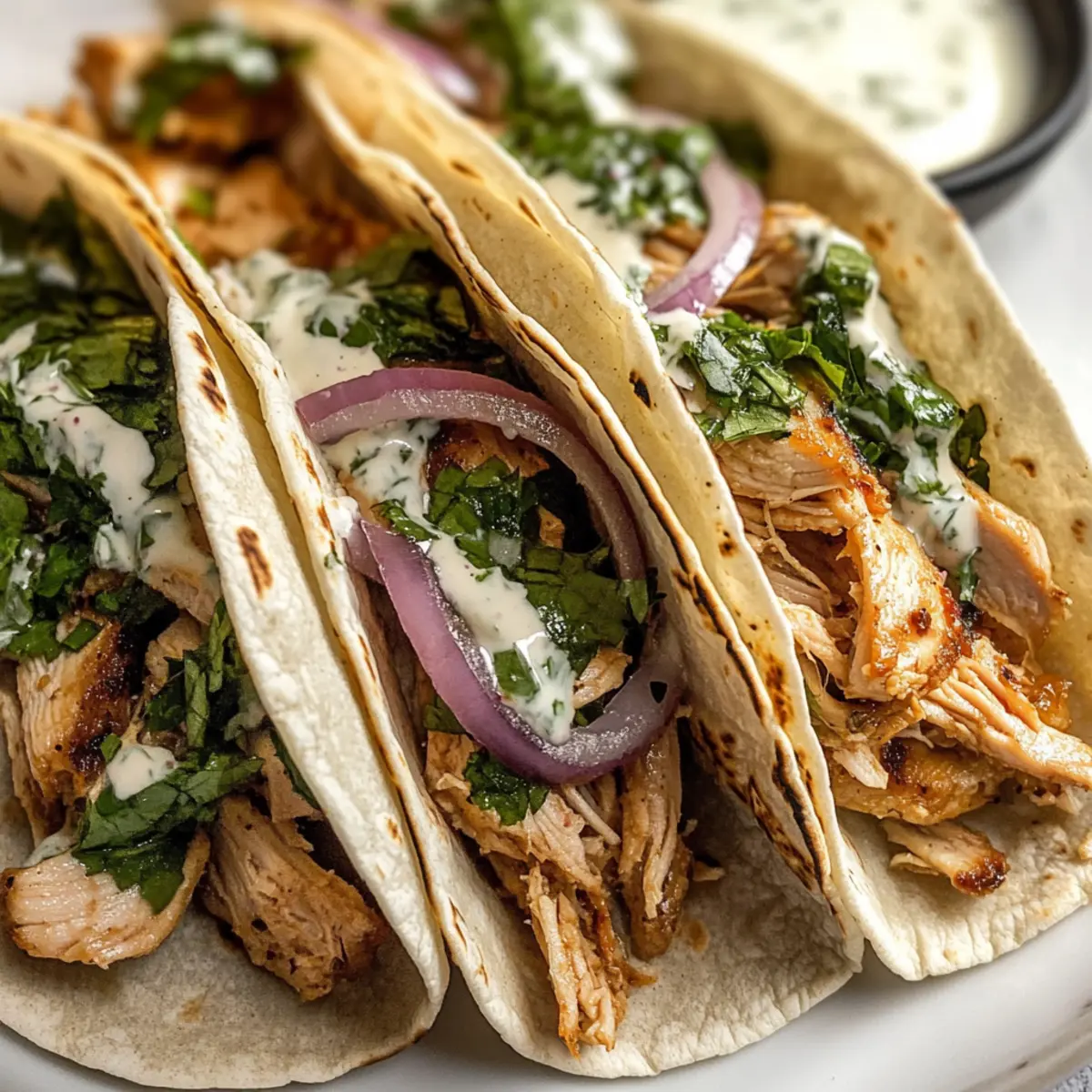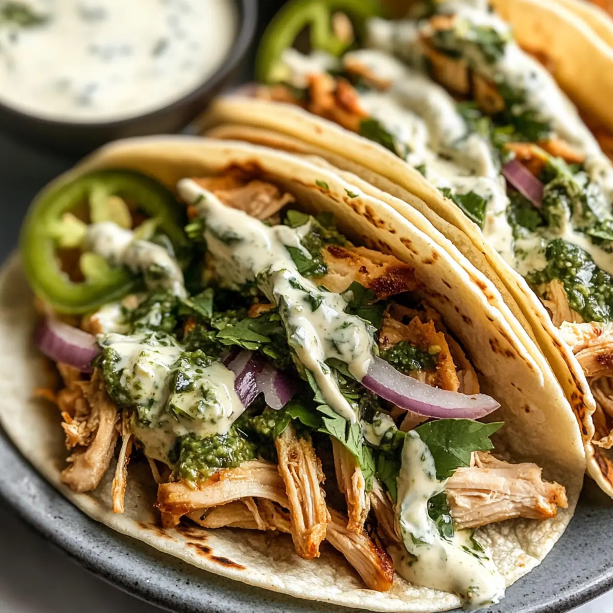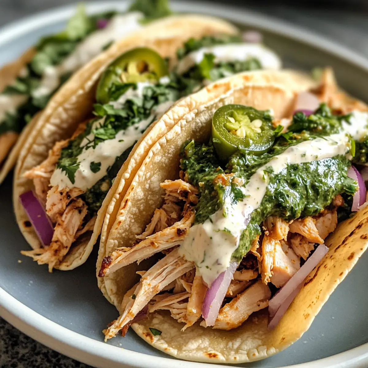 Das Geräusch des zischenden Hähnchens in der Pfanne ist ein köstlicher Vorbote für die Zerrissenen Hähnchen-Tacos, die gleich auf dem Tisch landen werden. Ich kann die Vorfreude förmlich spüren, wenn ich die frischen Zutaten vorbereite: bunte Jalapeños, knackige Romaine und die cremige Chimichurri-Sauce, die das Ganze zum Strahlen bringt. Diese kleinen Taco-Wunder sind nicht nur super schnell zuzubereiten, sondern bringen auch fröhliche Gesichter an jeden Tisch – perfekt für die stressigen Wochentage. Die Kombination aus zartem Hähnchen, frischen Aromen und der herzhaften Sauce macht jeden Bissen zu einem Erlebnis. Seid ihr bereit, eure Taco-Nächte auf ein neues Niveau zu heben? Warum sind Zerrissenes Hähnchen-Tacos so beliebt? Einfachheit: Die Zubereitung dieser Tacos ist kinderleicht und erfordert nur grundlegende Kochfähigkeiten. Frische Aromen: Mit frischen Zutaten wie Jalapeños und Romaine-Lettuce wird jeder Bissen zum Genuss. Vielseitigkeit: Du kannst die Füllung ganz nach deinem Geschmack anpassen – probiere zum Beispiel auch eine vegetarische Version mit schwarzem Bohnen oder gegrilltem Gemüse! Schnell zubereitet: Perfekt für hektische Wochentage, denn die Zubereitung dauert nur wenige Minuten. Köstliche Kombination: Die cremige Chimichurri-Sauce verleiht dem Gericht eine erfrischende Note und erfreut sowohl Familie als auch Freunde. Jeder wird die Kombination aus zartem Hähnchen und würziger Sauce lieben – ein echtes Highlight für deine nächste Taco-Nacht! Zutaten für Zerrissenes Hähnchen-Tacos • Für die Chimichurri-Sauce: Griechischer Joghurt – Verleiht der Sauce Cremigkeit; kann durch saure Sahne ersetzt werden für einen würzigeren Geschmack. Mayonnaise – Sorgt für Reichhaltigkeit und eine glatte Textur; wähle eine leichte Variante für eine kalorienfreundlichere Alternative. Schalotte – Bietet ein mildes Zwiebelaroma; kann durch fein gewürfelte Zwiebel ersetzt werden, falls Schalotten nicht verfügbar sind. Petersilie – Fügt Frische hinzu; kann durch Basilikum oder Koriander ersetzt werden, je nach Vorliebe. Koriander – Erhöht die Geschmacksvielfalt; bei Abneigung kann er weggelassen und mit zusätzlicher Petersilie ersetzt werden. Knoblauch – Gibt der Sauce einen kräftigen Geschmack; frischer Knoblauch ist ideal, aber Knoblauchpulver kann auch verwendet werden. Olivenöl – Dient als Basis für die Sauce und verstärkt den Geschmack; Avocadoöl ist ebenfalls eine milde Option. Rotweinessig – Sorgt für die notwendige Säure; alternativ kann Apfelessig verwendet werden. KOSHER-Salz – Verstärkt die Aromen; nach Belieben anpassen. • Für die Tacos: Hähnchenbrust – Das Hauptprotein für die Tacos; Hähnchenschenkel können für zusätzlichen Geschmack und Saftigkeit verwendet werden. Knoblauchpulver – Zum Würzen des Hähnchens; frischer, gehackter Knoblauch ist eine stärkere Alternative. Schwarzer Pfeffer – Für die Würze; nach persönlichem Geschmack anpassen. Jalapeño – Fügt Schärfe und Frische hinzu; kann für milde Tacos weggelassen oder durch Paprika ersetzt werden. Rote Zwiebel – Bringt eine scharfe, würzige Knusprigkeit; kann auch durch grüne Zwiebeln oder eingelegte Zwiebeln ersetzt werden. Tortillas – Die Grundlage für die Tacos; Weizentortillas sind weich, während Maistortillas glutenfrei sind und ebenfalls verwendet werden können. Romaine-Lettuce – Fügt Frische und Knusprigkeit hinzu; Eisbergsalat oder Spinat sind ebenfalls tolle Alternativen. Avocado – Sorgt für Cremigkeit und gesunde Fette; kann weggelassen oder durch Guacamole ersetzt werden. Feta-Käse – Gibt einen salzigen, pikanten Geschmack; Cotija oder zerbröckelter Ziegenkäse sind ebenfalls empfehlenswert. Diese Zutaten für die leckeren Zerrissenen Hähnchen-Tacos sind nicht nur einfach zu besorgen, sondern garantieren auch Freude bei jedem Bissen! Schritt-für-Schritt-Anleitung für Zerrissenes Hähnchen-Tacos mit cremiger Chimichurri-Sauce Step 1: Vorbereitung der cremigen Chimichurri-Sauce Vermische in einer Schüssel den griechischen Joghurt, die Mayonnaise, die fein gehackte Schalotte, die grob gehackte Petersilie, den Koriander, das Olivenöl sowie den Rotweinessig. Füge den zerdrückten Knoblauch und das Kosher-Salz hinzu. Verrühre die Zutaten gründlich mit einem Schneebesen, bis eine cremige und gut vermischte Sauce entsteht, und stelle sie beiseite. Step 2: Würzen des Hähnchens Mische in einer kleinen Schüssel das Knoblauchpulver, das Kosher-Salz und den schwarzen Pfeffer. Bestreiche die Hähnchenbrust gleichmäßig mit dieser Gewürzmischung. Lasse das gewürzte Hähnchen für etwa 10 Minuten ruhen, damit die Aromen besser einziehen können, während du die restlichen Zutaten vorbereitest. Step 3: Hähnchen kochen Erhitze in einer großen Pfanne bei mittlerer Hitze etwas Avocadoöl. Lege die Hähnchenbrust in die Pfanne und brate sie für 4-5 Minuten auf jeder Seite, bis sie goldbraun ist und eine Innentemperatur von 75°C erreicht hat. Nimm das Hähnchen aus der Pfanne, decke es ab und lasse es für ein paar Minuten ruhen, bevor du es zerrisst. Step 4: Gemüse anbraten In der gleichen Pfanne füge die gewürfelten Jalapeños und die rote Zwiebel hinzu. Schabe die angebratenen Röststoffe vom Boden der Pfanne ab und brate das Gemüse für 3-4 Minuten, bis die Zwiebeln weich und leicht glasig sind. Dies bringt zusätzliche Aromen, die perfekt zu den Zerrissenen Hähnchen-Tacos passen. Step 5: Hähnchen und Gemüse kombinieren Gib das zerrissene Hähnchen zurück in die Pfanne und mische es gut mit dem angebratenen Gemüse. Erhitze die Mischung bei mittlerer Hitze für weitere 1-2 Minuten, bis alles gut durchgewärmt ist und die Aromen sich verbunden haben. Step 6: Mit Koriander verfeinern Nimm die Pfanne vom Herd und rühre den frisch gehackten Koriander unter die Hähnchen-Gemüse-Mischung. Dies bringt einen frischen Geschmack, der die Zerrissenen Hähnchen-Tacos perfekt abrundet. Step 7: Tacos ass